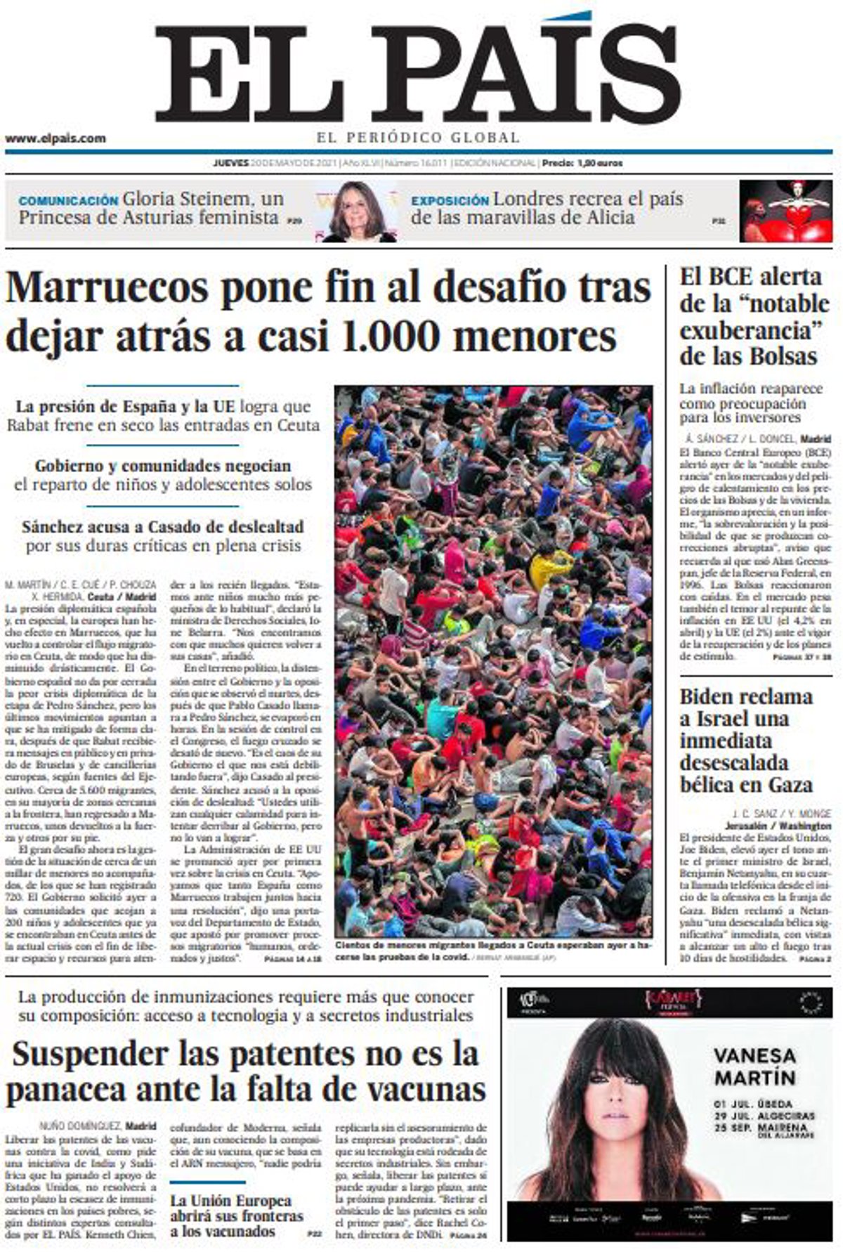 EL PAÍS: "Marruecos pone fin al desafío tras dejar atrás a casi 1.000 menores"; "Suspender las patentes no es la panacea ante la falta de vacunas"; "La Unión Europea abrirá sus fronteras a los vacunados"; "El BCE alerta de la "notable exuberancia" de las Bolsas"; "Biden reclama a Israel una inmediata desescalada bélica en Gaza".