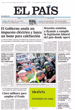 EL PAÍS: "El Gobierno anula un impuesto eléctrico y lanza un bono para calefacción"; "Bruselas conmina a Ryanair a cumplir la legislación laboral del país donde opere"; "El libro de Pedro Sánchez y Carlos Ocaña copia párrafos de una conferencia"; "Cataluña vuelve al foro de financiación con el resto de las autonomías".