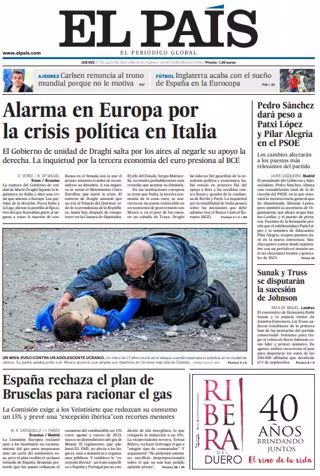 EL PAÍS: "Alarma en Europa por la crisis política en Italia. El Gobierno de unidad de Draghi salta por los aires al negarle su apoyo la derecha. La inquietud por la tercera economía del euro presiona al BCE"; "España rechaza el plan de Bruselas para racionar el gas. La Comisión exige a los Veintisiete que reduzcan su consumo un 15% y prevé una "excepción ibérica"con recortes menores"; "Pedro Sánchez dará peso a Patxi López y Pilar Alegría en el PSOE"; "Sunak y Truss se disputarán la sucesión de Johnson".