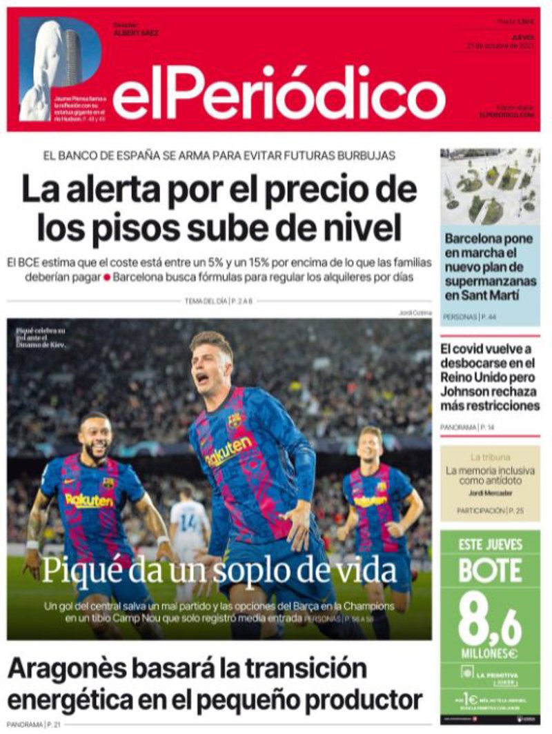 EL PERIÓDICO: "La alerta por el precio de los pisos sube de nivel"; "Piqué da un soplo de vida"; "Aragonès basará la transición energética en el pequeño productor"; "Barcelona pone en marcha el nuevo plan de supermanzanas en Sant Martí"; "El covid vuelve a desbocarse en el Reino Unido pero Johnson rechaza más restricciones".