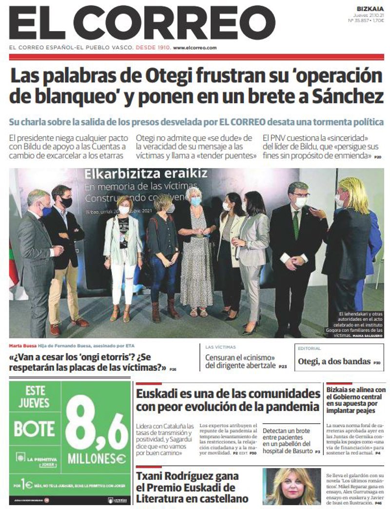 EL CORREO: "Las palabras de Otegi frustran su 'operación de blanqueo' y ponen en un brete a Sánchez"; "Marta Buesa Hija de Fernando Buesa, asesinado por ETA: "¿Van a cesar los 'ongi etorris'? ¿Se respetarán las placas de las víctimas?""; "Euskadi es una de las comunidades con peor evolución de la pandemia"; "Bizkaia se alinea con el Gobierno central en su apuesta por implantar peajes"; "Txani Rodríguez gana el Premio Euskadi de Literatura en castellano".
