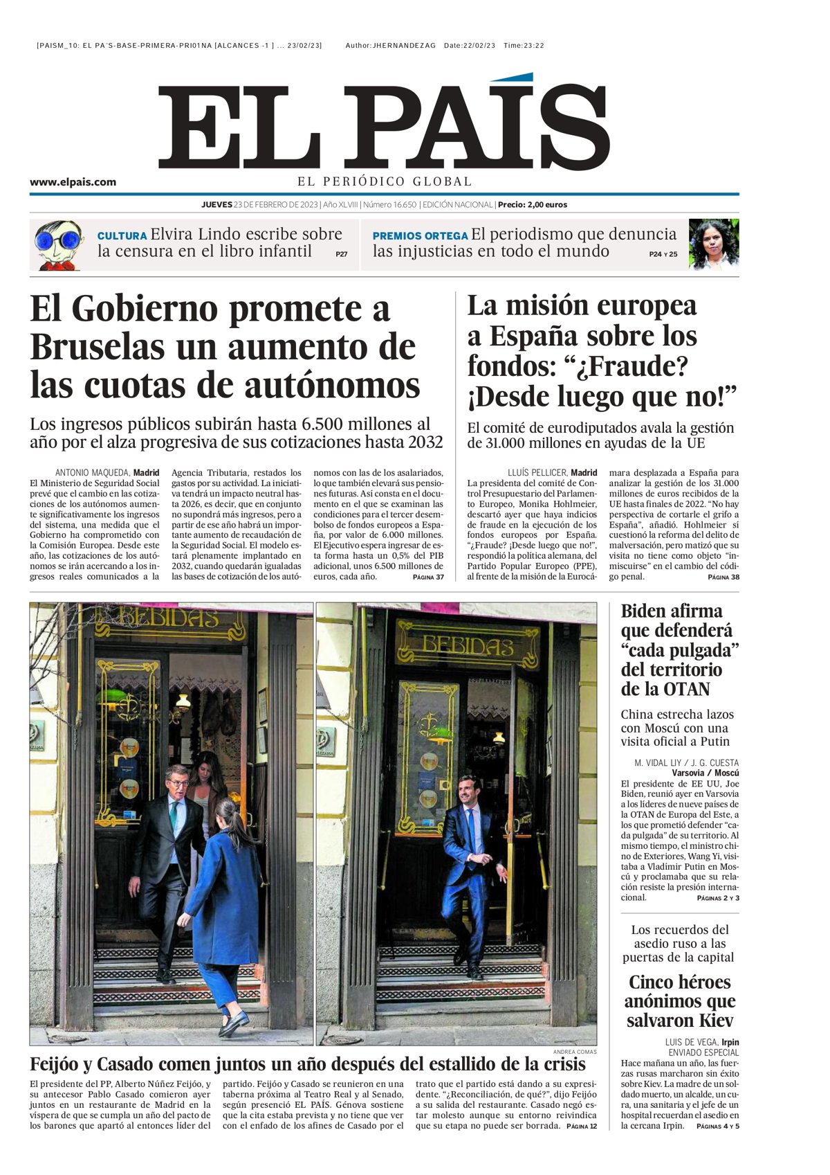 EL PAÍS: "El Gobierno promete a Bruselas un aumento de las cuotas de autónomos"; "Feijóo y Casado comen juntos un año después del estallido de la crisis"; "La misión europea a España sobre los fondos: "¿Fraude? ¡Desde luego que no!""; "Biden afirma que defenderá