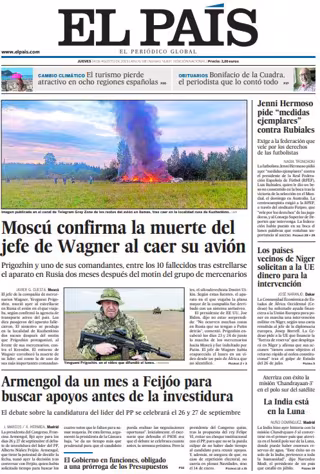 EL PAÍS: "Moscú confirma la muerte del jefe de Wagner al caer su avión"; "Armengol da un mes a Feijóo para buscar apoyos antes de la investidura"; "Jenni Hermoso pide "medidas ejemplares" contra Rubiales"; "Los países vecinos de Níger solicitan a la UE dinero para la intervención"; "La India está en la Luna".