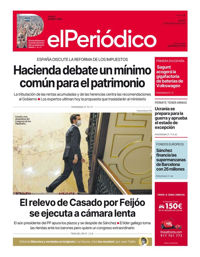 EL PERIÓDICO: "Hacienda debate un mínimo común para el patrimonio"; "El relevo de Casado por Feijóo se ejecuta a cámara lenta"; "Ucrania se prepara para la guerra y aprueba el estado de excepción"; "Sagunt acogerá la gigafactoría de baterías de VW"; "Sánchez financia las supermanzanas de Barcelona con 26 millones".