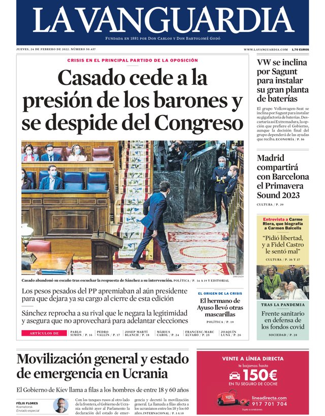 LA VANGUARDIA: "Casado cede a la presión de los barones y se despide del Congreso"; "Movilización general y estado de emergencia en Ucrania"; "VW se inclina por Sagunt para instalar su gran planta de baterías"; "Madrid compartirá en Barcelona el Primavera Sound 2023".