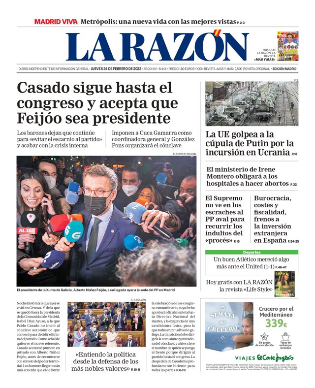 LA RAZÓN: "Casado sigue hasta el congreso y acepta que Feijóo sea presidente"; "La UE golpea a la cúpula de Putin por la incursión en Ucrania"; "El ministerio de Irene Montero obligará a los hospitales a hacer abortos"; "El Supreo no ve en los escraches al PP aval para recurrir los indultos del procés"; "Burocracia, costes y fiscalidad, frenos a la inversión extranjera en España".