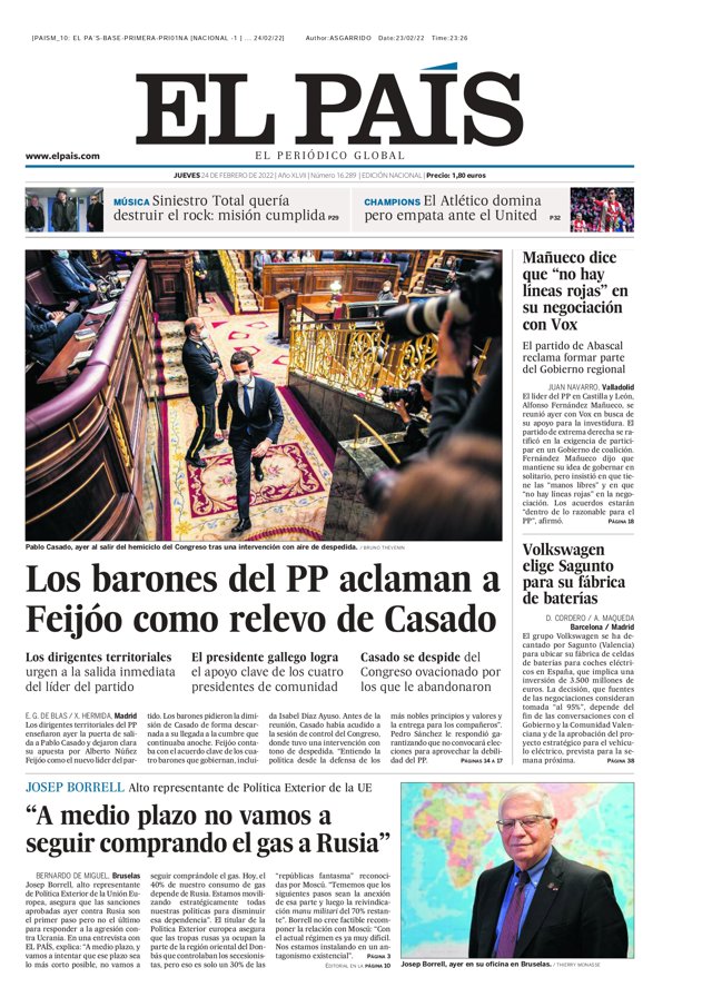 EL PAÍS: "Los barones del PP aclaman a Feijóo como relevo de Casado"; "Mañueco dice que no hay líneas rojas en su negociación con Vox"; "Volkswagen elige Sagunto para su fábrica de baterías"; "Borrell: A medio plazo no vamos a seguir comprando el gas a Rusia".