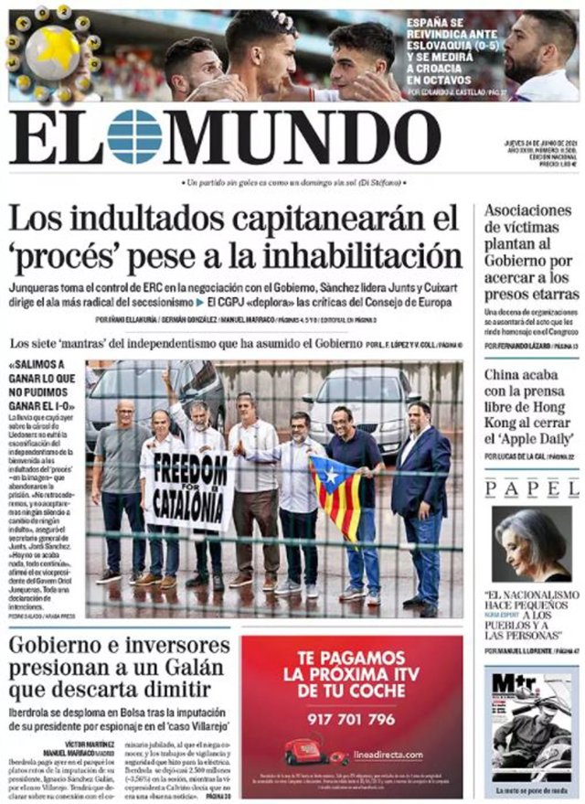 EL MUNDO: "Los indultos capitanearán el 'procés' pese a la inhabilitación"; "Gobierno e inversores presionan a un Galán que descarta dimitir"; "Asociaciones de víctimas plantan al Gobierno por acercar a los presos etarras"; "China acaba con la prensa libre de Hong Kong al cerrar el 'Apple Daily'"; "España se reivindica ante Eslovaquia (0-5) y se medirá a Croacia en octavos".