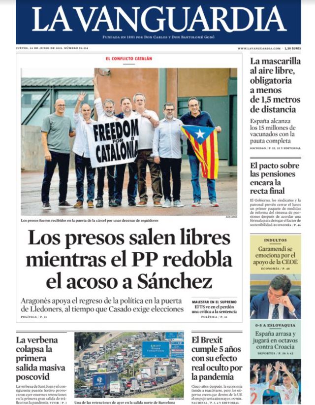 LA VANGUARDIA: "Los presos salen libres mientras el PP redobla el acoso a Sánchez"; "La verbena colapsa la primera salida masiva poscovid"; "La mascarilla al aire libre, obligatoria a menos de 1,5 metros de distancia"; "El pacto sobre las pensiones encara la recta final"; "El Brexit cumple 5 años con su efecto real oculto por la pandemia"; "Garamendi se emociona por el apoyo de la CEOE"; "España arrasa y jugará en octavos contra Croacia".