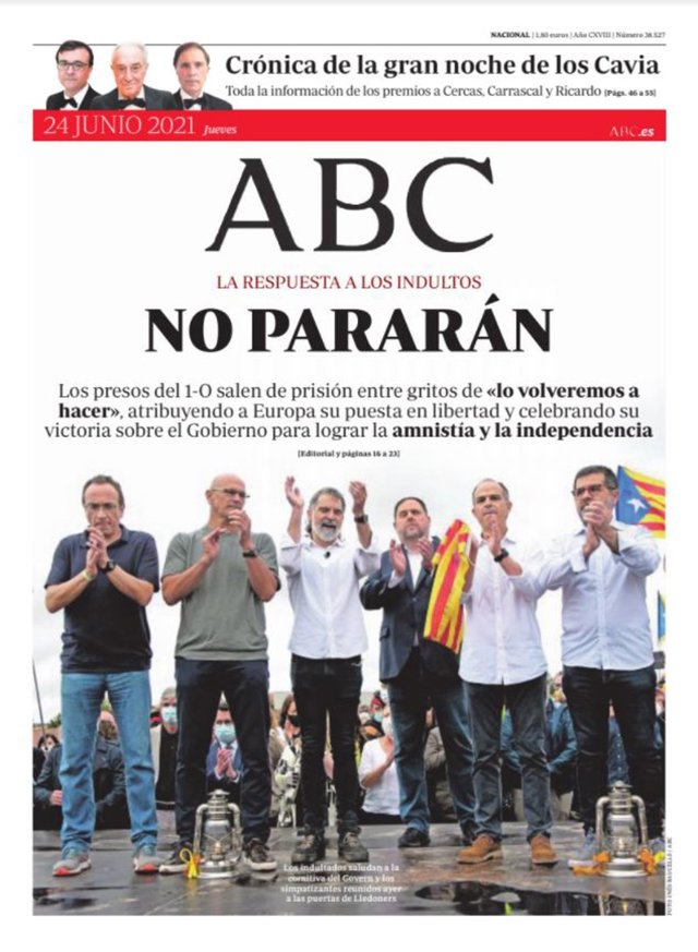 ABC: "Crónica de la gran noche de los Cavia"; "No pararán. Los presos del 1-O salen de prisión entre gritos de 'lo volveremos a hacer', atribuyendo a Europa su puesta en libertad y celebrando su victoria sobre el Gobierno para lograr la amnistía y la independencia".