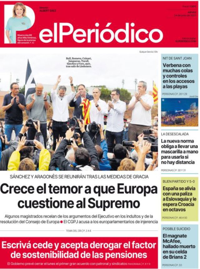 EL PERIÓDICO: "Crece el temor a que Europa cuestione al Supremo"; "Escrivá cede y acepta derogar el factor de sostenibilidad de las pensiones"; "Verbena con muchas colas y controles en los accesos a la playas"; "La nueva norma obliga a llevar una mascarilla a mano para usarla si no hay distancia"; "España se alivia con una paliza a Eslovaquia y le espera Croacia en octavos"; "El magnate McAfee, hallado muerto en su celda de Brians 2".
