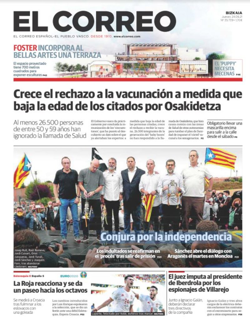 EL CORREO: "Crece el rechazo a la vacunación a medida que baja la edad de los citados por Osakidetza"; "La Roja reacciona y se da un paseo hacia los octavos"; "El juez imputa al presidente de Iberdrola por los espionajes de Villarejo"; "Conjura por la independencia".
