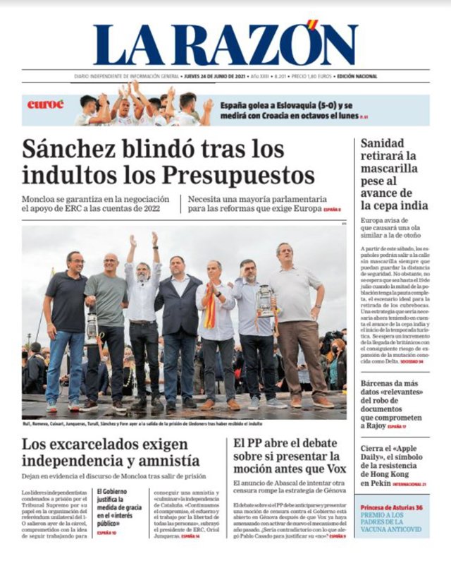LA RAZÓN: "Sánchez blindó tras los indultos los Presupuestos"; "Sanidad retirará la mascarilla pese al avance de la cepa india"; "Los excarcelados exigen independencia y amnistía"; "El PP abre el debate sobre si presentar la moción antes que Vox"; "Bárcenas da más datos 'relevantes' del robo de documentos que comprometen a Rajoy"; "Cierra el 'Apple Daily', el símbolo de la resistencia de Hong Kong en Pekín".