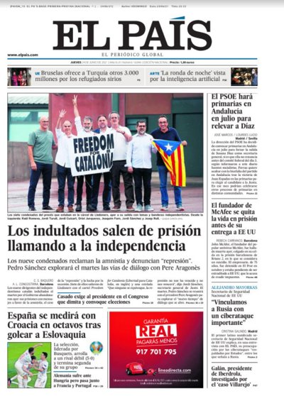 EL PAÍS: "Los indultados salen de prisión llamando a la independencia"; "España se medirá con Croacia en octavos tras golear a Eslovaquia"; "El PSOE hará primarias en Andalucía en julio para relevar a Díaz"; "El fundador de McAfee se quita la vida en prisión antes de su entrega a EEUU"; "Galán, presidente de Iberdrola, investigado por el 'caso Villarejo'"; "Alejandro Mayorkas: 'Vinculamos a Rusia con un ciberataque importante'".