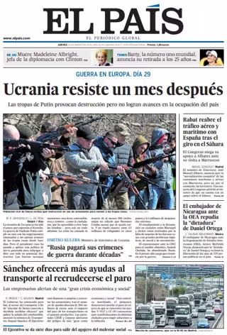 EL PAÍS: "Ucrania resiste un mes después. Las tropas de Putin provocan destrucción pero no logran avances en la ocupación del país"; "Sánchez ofrecerá más ayudas al transporte al recrudecerse el paro. Los empresarios alertan de una "gran crisis económica y social"; "Dmitro Kuleba, ministro de Exteriores de Ucrania: "Rusia pagará sus crímenes de guerra durante décadas""; "Rabat reabre el tráfico aéreo y marítimo con España tras el giro en el Sáhara"; "El embajador de Nicaragua ante la OEA repudia la "dictadura" de Daniel Ortega".
