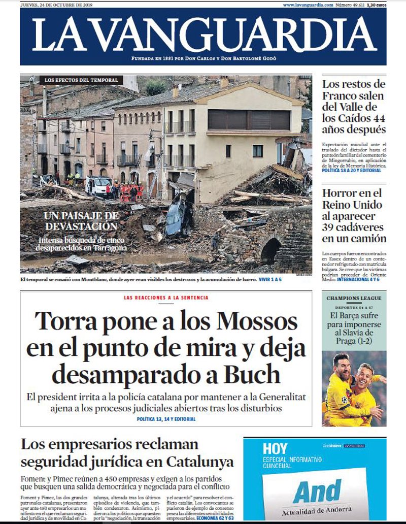 LA VANGUARDIA: "Un paisaje de devastación. Intensa búsqueda de cinco desaparecidos en Tarragona"; "Torra pone a los Mossos en el punto de mira y deja desamparado a Buch"; "Los empresarios reclaman seguridad jurídica en Catalunya"; "Los restos de Franco salen del Valle de los Caídos 44 años después"; "Horror en el Reino Unido al aparecer 39 cadáveres en un camión"; "El Barça sufre para imponerse al Slavia de Praga (1-2)".