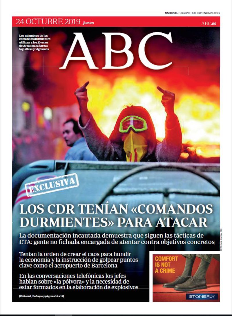 ABC: "Los CDR tenían "comandos durmientes" para atacar. La documentación incautada demuestra que siguen las tácticas de ETA: gente no fichada encargada de atentar contra objetivos concretos. Tenían la orden de crear el caos para hundir la economía y la instrucción de golpear puntos clave como el aeropuerto de Barcelona. En las conversaciones telefónicas los jefes hablan sobre "la pólvora" y la necesidad de estar formados en la elaboración de explosivos".