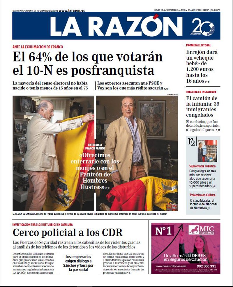 LA RAZÓN: "El 64% de los que votarán el 10-N es posfranquista"; "Francis Franco: "Ofrecimos enterrarle con los monjes o en el Panteón de Hombres Ilustres""; "Cerco policial a los CDR. Los empresarios exigen diálogo a Sánchez y Torra por la paz social"; "Errejón dará un "cheque bebé" de 1.200 euros hasta los 16 años"; "El camión de la infamia: 39 inmigrantes congelados"; "Google logra en tres minutos resolver algo que supondría 10.000 años a un superordenador"; "Cristina Morales: el incendio del Nacional de Narrativa".