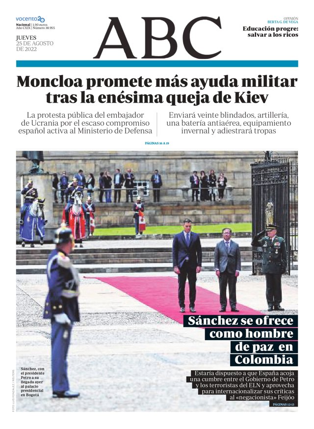 ABC: "Moncloa promete más ayuda militar tras la enésima queja de Kiev"; "Sánchez se ofrece como hombre de paz en Colombia"
