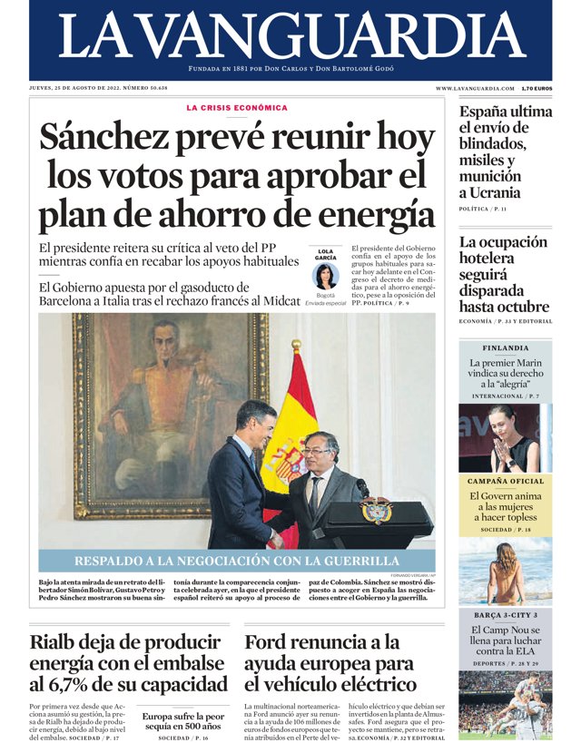 plan de ahorro de energía"; "España ultima el envío de blindados, misiles y munición a Ucrania"; "La ocupación hotelera seguirá disparada hasta octubre"; "Rialb deja de producir energía con el embalse al 6,7% de su capacidad"; "Ford renuncia a la ayuda europea para el vehículo eléctrico".