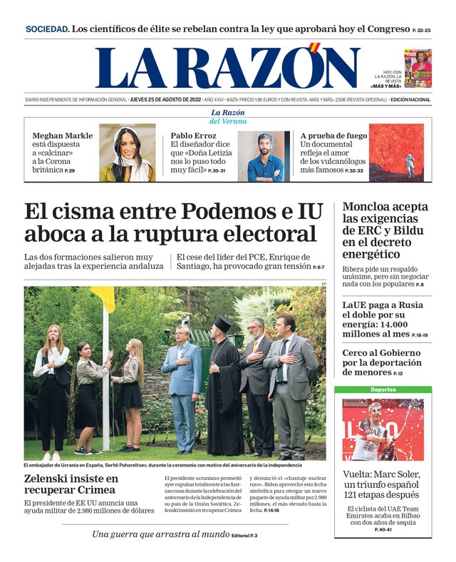 LA RAZÓN: "El cisma entre Podemos e IU aboca a la ruptura electoral"; "Moncloa acepta las exigencias de ERC y Bildu en el decreto energético"; "La UE paga a Rusia el doble por su energía: 14.000 millones al mes"; "Cerco al Gobierno por la deportación de menores"; "Zelenski insiste en recuperar Crimea"; "Vuelta: Marc Soler, un triunfo español 121 etapas después".
