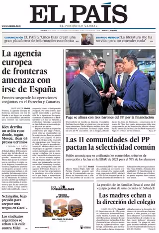 EL PAÍS: "La agencia europea de fronteras amenaza con irse de España"; "Las 11 comunidades del PP pactan la selectividad común"; "Page se alinea con tres barones del PP por la financiación"; "Kiev derriba un avión ruso donde, según Moscú, iban 65 presos ucranios"; "Netanyahu, bajo presión para aceptar una tregua en Gaza"; "Los sindicatos argentinos se echan a la calle contra Milei"; "Las madres echan a la dirección del colegio".