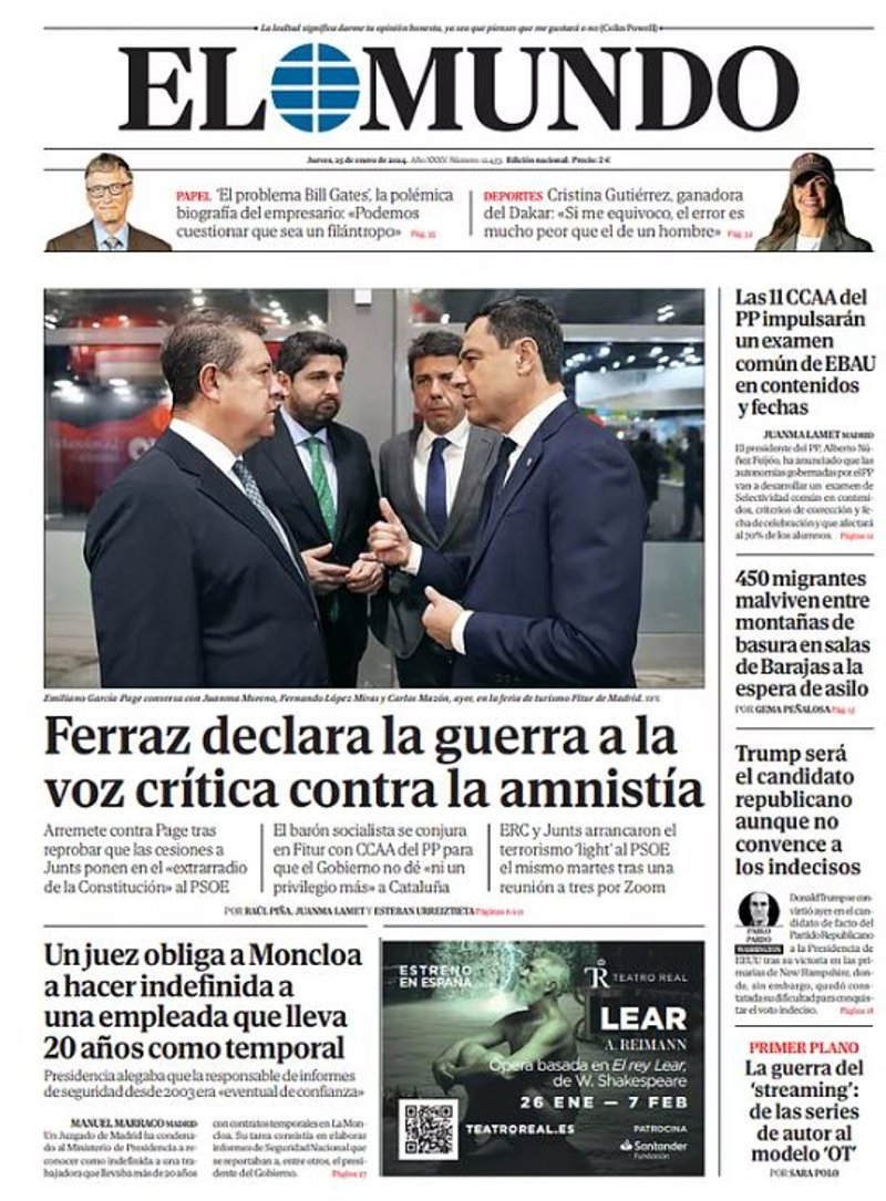 EL MUNDO: "Ferraz declara la guerra a la voz crítica contra la amnistía"; "Un juez obliga a Moncloa a hacer indefinida a una empleada que lleva 20 años como temporal"; "Las 11 CCAA del PP impulsarán un examen común de EBAU en contenidos y fechas"; "450 migrantes malviven entre montañas de basura en salas de Barajas a la espera de asilo"; "Trump será el candidato republicano aunque no convence a los indecisos"; "La guerra del 'streaming': de las series de autor al modelo 'OT'".