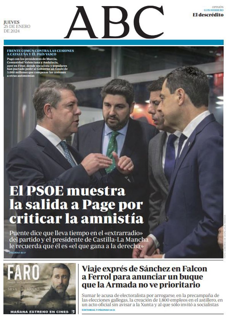 ABC: "El PSOE muestra la salida a Page por criticar la amnistía"; "Viaje exprés de Sánchez en Falcon a Ferrol para anunciar un buque que la Armada no ve prioritario".