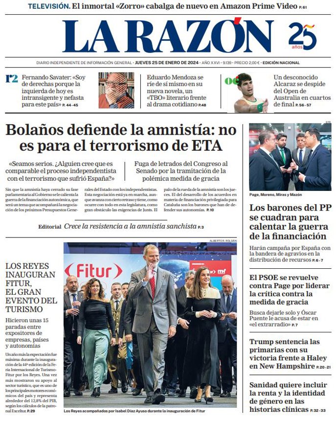 LA RAZÓN: "Bolaños defiende la amnistía: no es para el terrorismo de ETA"; "Los barones del PP se cuadran para calentar la guerra de la financiación"; "El PSOE se revuelve contra Page por liderar la crítica contra la medida de gracia"; "Trump sentencia las primarias con su victoria frente a Haley en New Hampshire"; "Sanidad quiere incluir la renta y la identidad de género en las historias clínicas".
