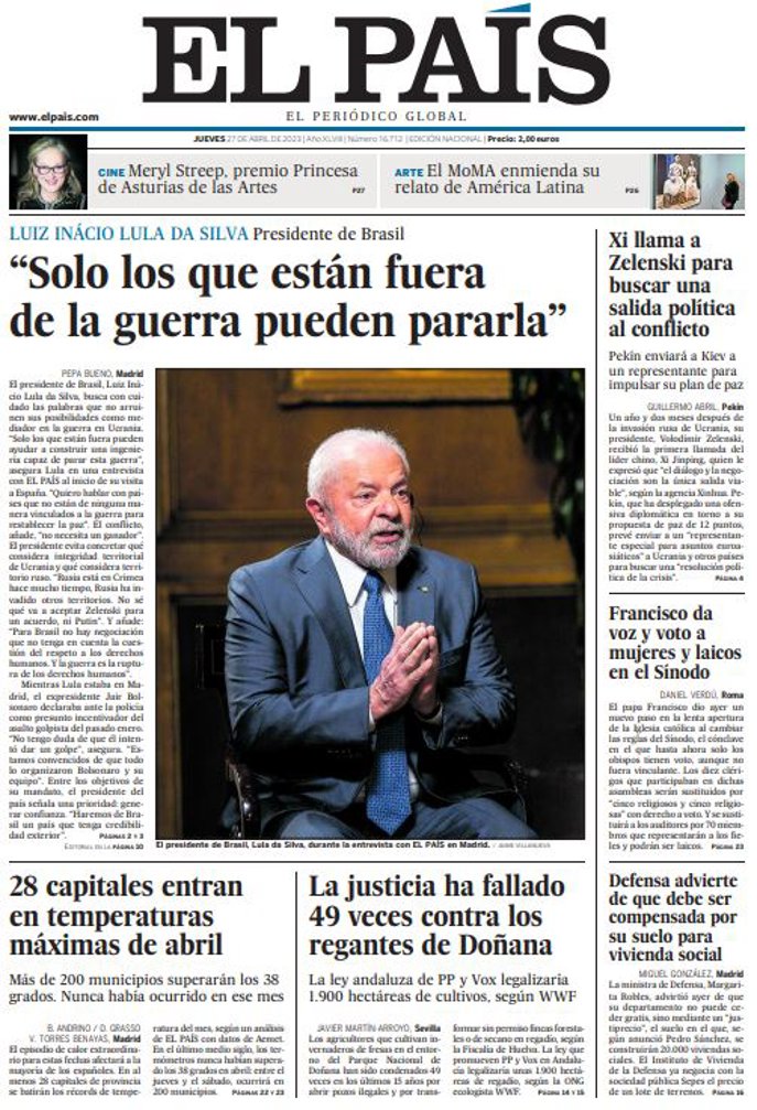 EL PAÍS: "Luiz Inácio Lula da Silva, presidente de Brasil: "Solo los que están fuera de la guerra pueden pararla"; "28 capitales entran en temperaturas máximas de abril"; "Xi llama a Zelenski para buscar una salida política al conflicto"; "Francisco da voz y voto a mujeres y laicos en el Sínodo"; "Defensa advierte de que debe ser compensada por su suelo para vivienda social".