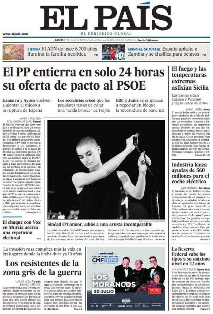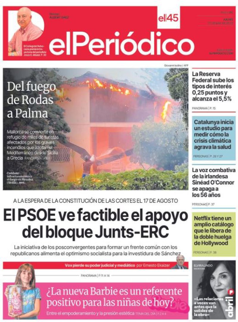 EL PERIÓDICO: "Del fuego de Rodas a Palma"; El PSOE ve factible el apoyo del bloque Junts-ERC"; "La reserva federal sube los tipos de interés 0,25 puntos y alcanza el 5,5%"; "Catalunya inicia un estudio para medir cómo la crisis climática agrava la salud"; "La voz combativa de la irlandesa Sinéad O'Connor se apaga a los 56 años"; "Netflix tiene un amplio catálogo que le libera de la doble huelga de Hollywood".