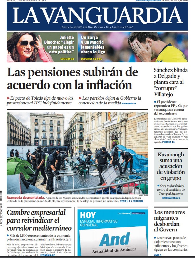 LA VANGUARDIA: "Las pensiones subirán de acuerdo con la inflación"; "Cumbre empresarial para reivindicar el corredor mediterráneo"; "Sánchez blinda a Delgado y planta cara al "corrupto" Villarejo"; "Kavanaugh suma una acusación de violación en grupo"; "Los menores migrantes desbordan al Govern".