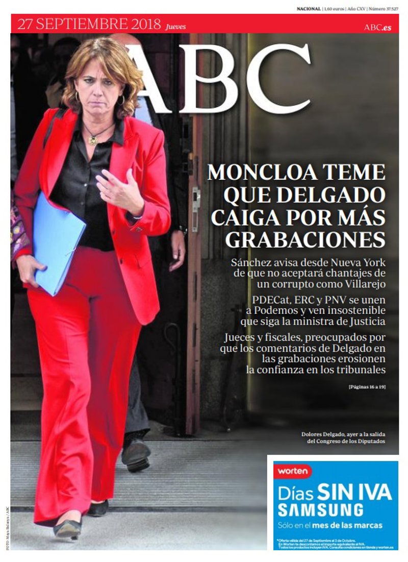ABC: "Moncloa teme que Delgado caiga por más grabaciones"; "Sánchez avisa desde Nueva York de que no aceptará chantajes de un corrupto como Villarejo"; "PDECat, ERC y PNV se unen a Podemos y ven insostenible que siga la ministra de Justicia"; "Jueces y fiscales, preocupados por que los comentarios de Delgado en las grabaciones erosionen la confianza en los tribunales".