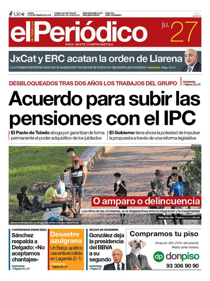 EL PERIÓDICO: "Acuerdo para subir las pensiones con el IPC"; "JxCat y ERC acatan la orden de Llarena"; "Sánchez respalda a Delgado: "No aceptamos chantajes"; "Desastre azulgrana: Un Barça apático cae ante el colista en Leganés (2-1)"; "González deja la presidencia del BBVA a su segundo".