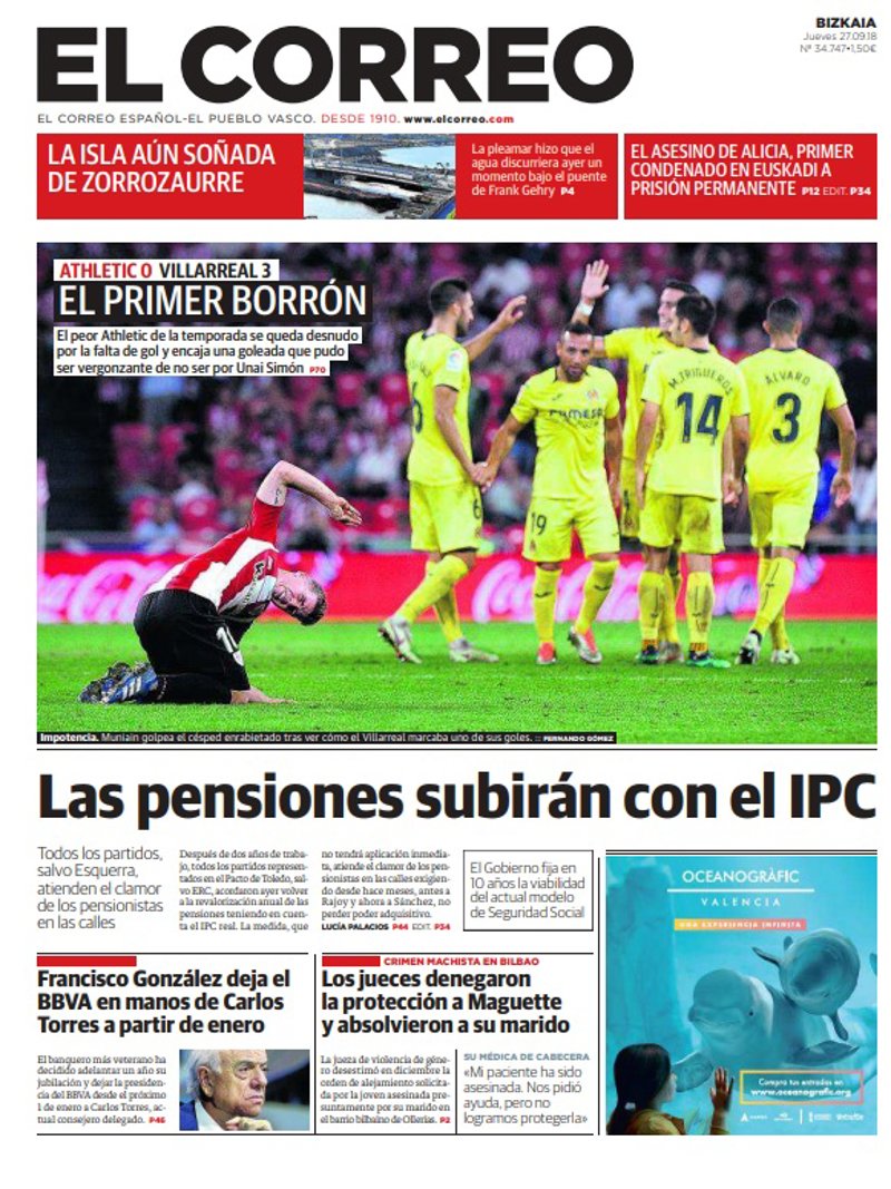 EL CORREO: "Las pensiones subirán con el IPC"; "Francisco González deja el BBVA en manos de Carlos Torres a partir de enero"; "Los jueces denegaron la protección a Maguette y absolvieron a su marido"; "El asesino de Alicia, primer condenado en Euskadi a prisión permanente".