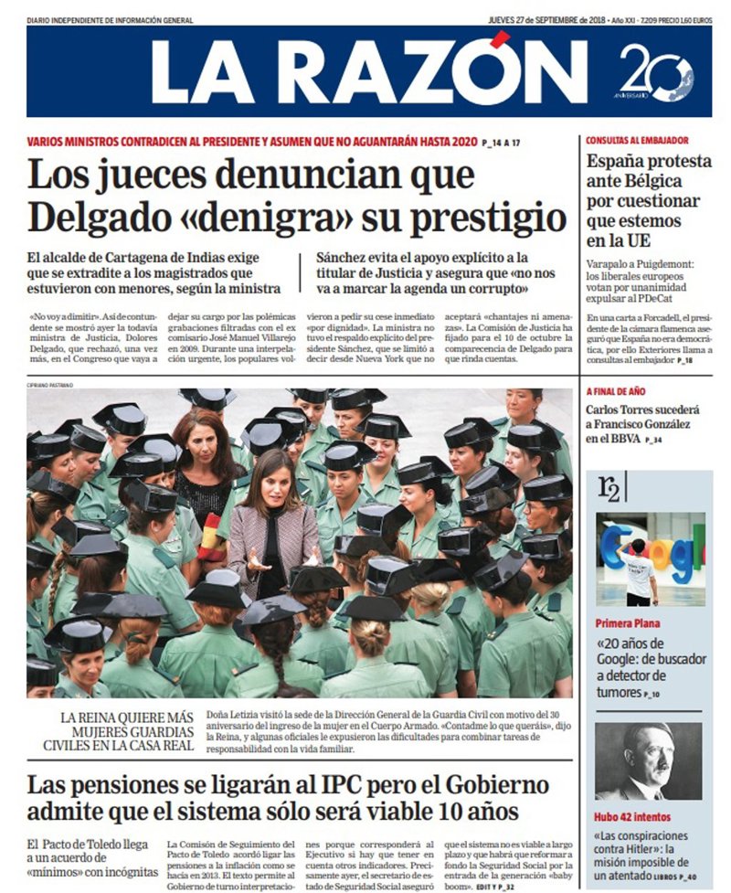 LA RAZÓN: "Los jueces denuncian que Delgado "denigra" su prestigio"; "Las pensiones se ligarán al IPC pero el Gobierno admite que el sistema sólo será viable 10 años"; "España protesta