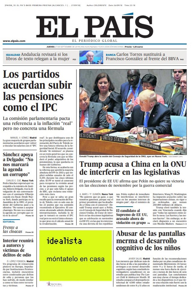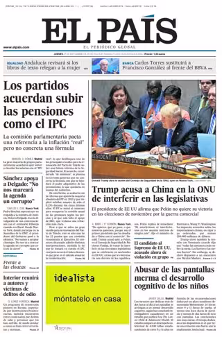 EL PAÍS: "Los partidos acuerdan subir las pensiones como el IPC"; "Trump acusa a China en la ONU de interferir en las legislativas"; "Sánchez apoya a Delgado: "No nos marcará la agenda un corrupto""; "Interior reunirá a autores y víctimas de delitos de odio"; "Abusar de las pantallas merma el desarrollo cognitivo de los niños".