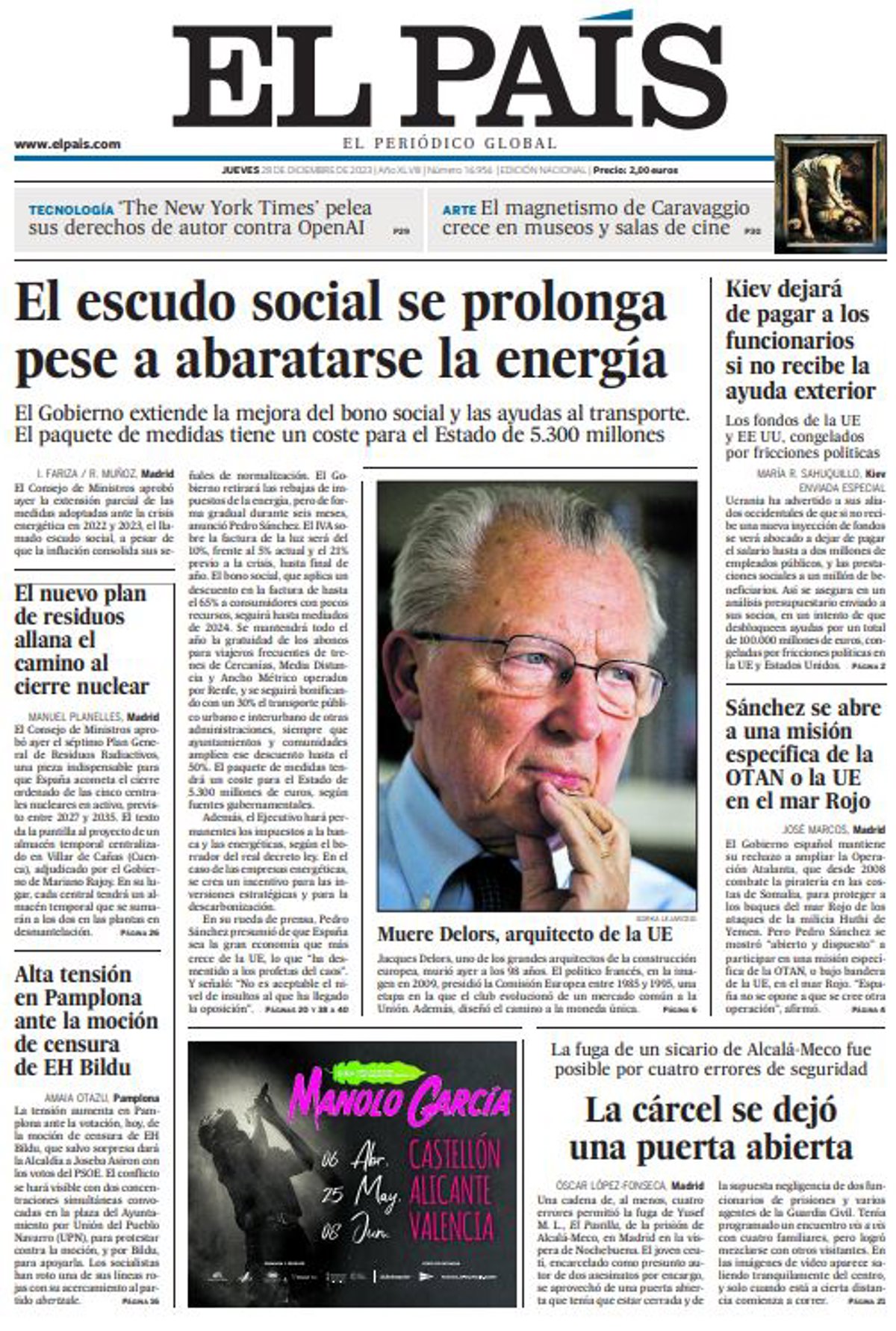 EL PAÍS: "El escudo social se prolonga pese a abaratarse la energía"; "El nuevo plan de residuos allana el camino al cierre nuclear"; "Alta tensión en Pamplona ante la moción de censura de EH Bildu"; "Kiev dejará de pagar a los funcionarios si no recibe la ayuda exterior"; "Sánchez se abre a una misión específica de la OTAN o la UE en el mar Rojo"; "La cárcel se dejó una puerta abierta".