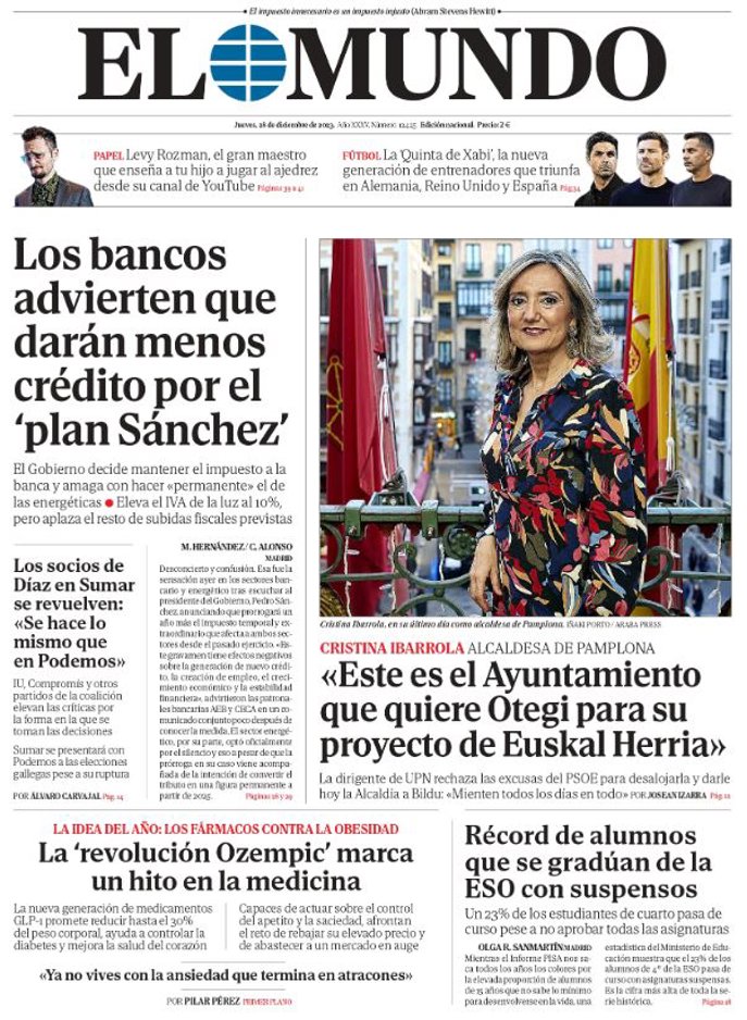 EL MUNDO: "Los bancos advierten que darán menos crédito por el 'plan Sánchez'"; "Los socios de Díaz en Sumar se revuelven: "Se hace lo mismo que Podemos""; "Cristina Ibarrola: "Este es el Ayuntamiento que quiere Otegi para su proyecto de Euskal Herria"; "La 'revolución Ozempic' marca un hito en la medicina"; "Récord de alumnos que se gradúan con suspensos".