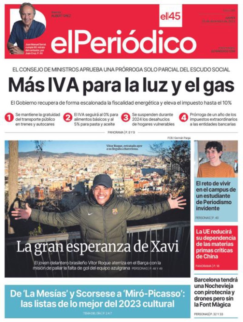 EL PERIÓDICO: "Más IVA para la luz y el gas"; "La gran esperanza de Xavi"; "El reto de vivir en el campus de un estudiante de Periodismo invidente"; "La UE reducirá su dependencia de las materias primas críticas de China"; "Barcelona tendrá una Nochevieja con pirotecnia y drones pero sin la Font Mágica".