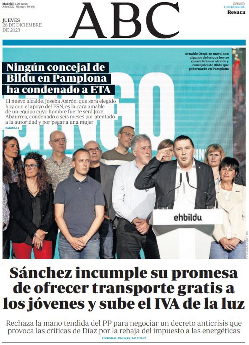 ABC: "Ningún concejal de Bildu en Pamplona ha condenado a ETA"; "Sánchez incumple su promesa de ofrecer transporte gratis a los jóvenes y sube el IVA de la luz".