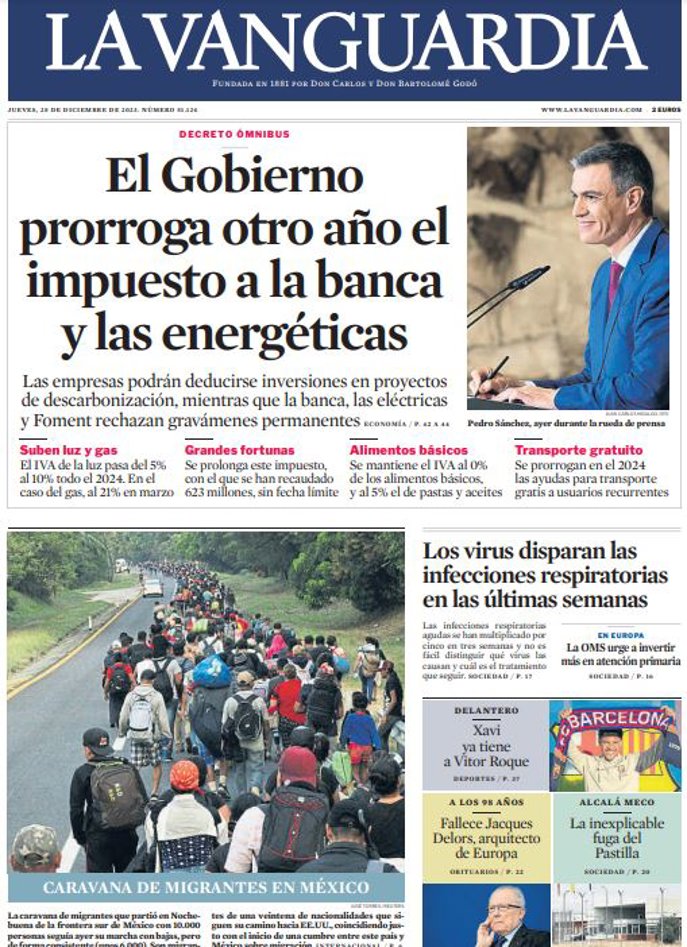 LA VANGUARDIA: "El Gobierno prorroga otro año el impuesto a la banca y las energéticas"; "Los virus disparan las infecciones respiratorias en las últimas semanas".