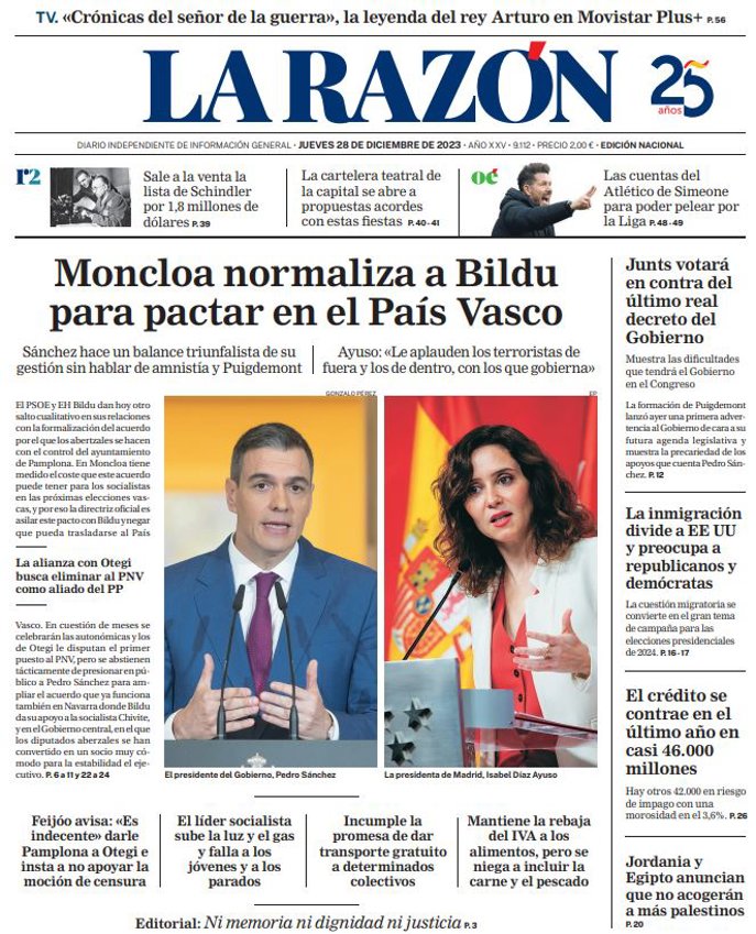 LA RAZÓN: "Moncloa normaliza a Bildu para pactar en el País Vasco"; "Junts votará en contra del último real decreto del Gobierno"; "La inmigración divide a EE UU y preocupa a republicanos y demócratas""; "El crédito se contrae en el último año en casi 46.000 millones"; "Jordania y Egipto anuncian que no acogerán a más palestinos".
