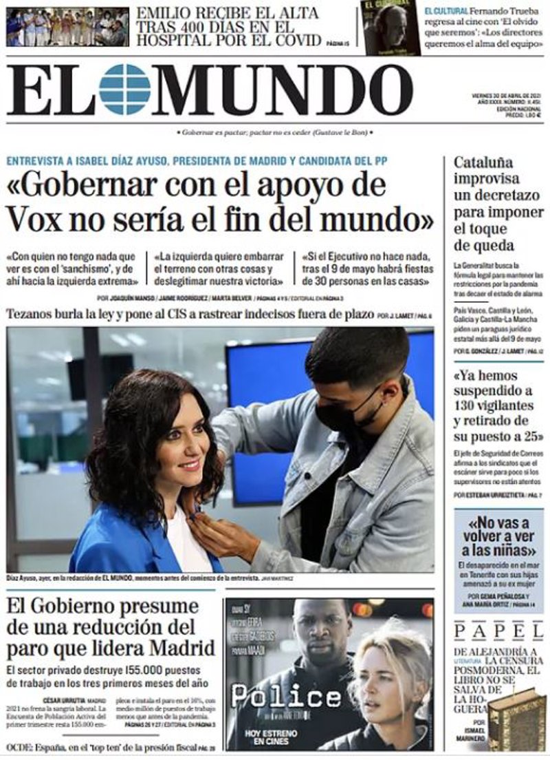 EL MUNDO: "Ayuso: 'Gobernar con el apoyo de Vox no sería el fin del mundo'"; "Cataluña improvisa un decreto para imponer el toque de queda"; "El Gobierno presume de una reducción del paro que lidera Madrid"; "'Ya hemos suspendido a 130 vigilantes y retirado su puesto a 25'".