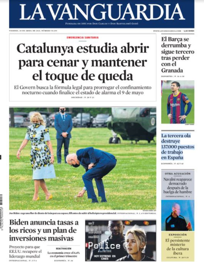 LA VANGUARDIA: "Catalunya estudia abrir para cenar y mantener el toque de queda"; "Biden anuncia tasas a los ricos y un plan de inversiones masivas"; "El Barça se derrumba y sigue tercero tras perder con el Granada"; "La tercera ola destruye 137.000 puestos de trabajo en España".