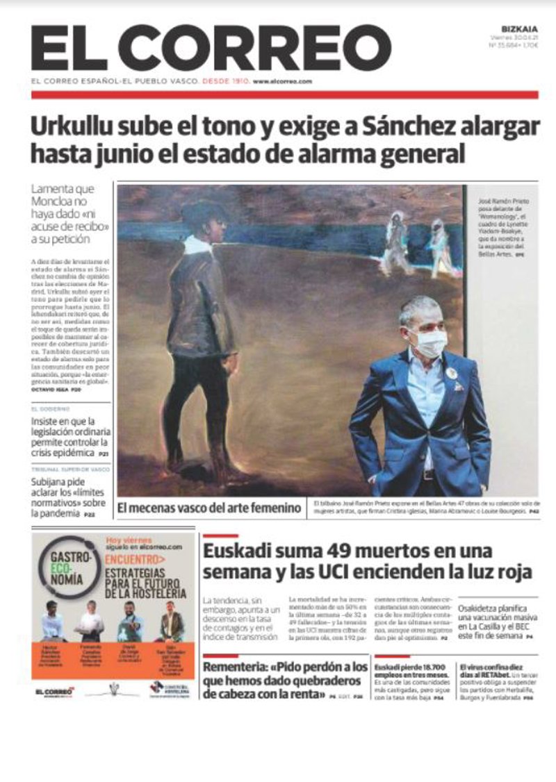 EL CORREO: "Urkullu sube el tono y exige a Sánchez alargar hasta junio el estado de alarma general"; "Euskadi suma 49 muertos en una semana y las UCI encienden la luz roja"; "Rementeria: 'Pido perdón a los que hemos dado quebraderos de cabeza con la renta'"; "Euskadi pierde 18.700 empleos en tres meses"; "El virus confina diez días al RETAbet".