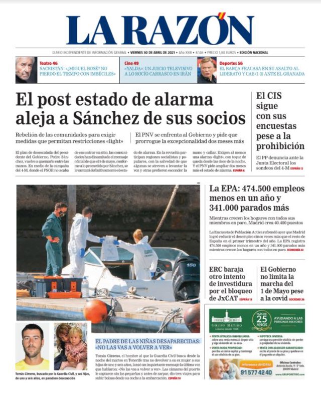 LA RAZÓN: "El post estado de alarma aleja a Sánchez de sus socios"; "El CIS sigue con sus encuestas pese a la prohibición"; "La EPA: 474.500 empleos menos en un año y 341.000 parados más"; "ERC baraja otro intento de investidura por el bloqueo de JxCAT"; "El Gobierno no limita la marcha del 1 de Mayo pese a la covid"; "El padre de las niñas desaparecidad: 'No las vas a volver a ver'".