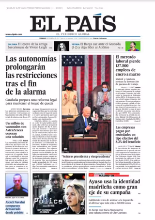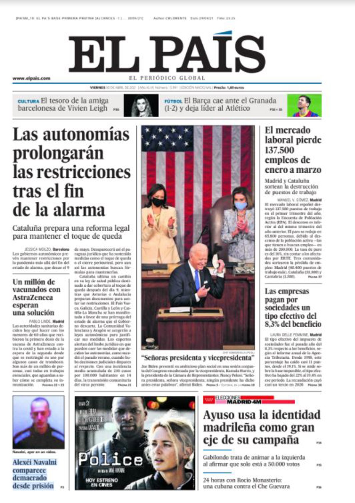 EL PAÍS: "Las autonomías prolongarán las restricciones tras el fin de la alarma"; "El mercado laboral pierde 137.500 empleos de enero a marzo"; "Las empresas pagan por sociedades un tipo efectivo del 8,3% del beneficio"; "Ayuso usa la identidad madrileña como gran eje de su campaña"; "Un millón de vacunados con AstraZeneca esperan una solución"; "Alexéi Navalni comparece demacrado desde prisión".