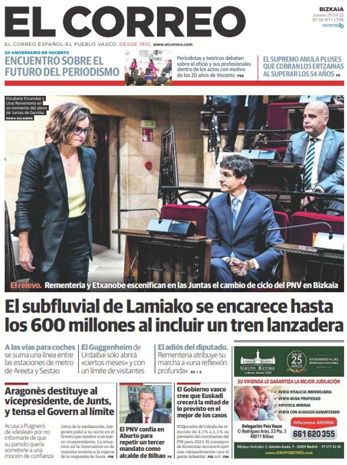 EL CORREO: "El subfluvial de Lamiako se encarece hasta los 600 millones al incluir un tren lanzadera"; "Aragonès destituye al vicepresidente, de Junts, y tensa el Govern al límite"; "El PNV confía en Aburto para repetir un tercer mandato como alcalde de Bilbao"; "El Gobierno vasco cree que Euskadi crecerá la mitad de