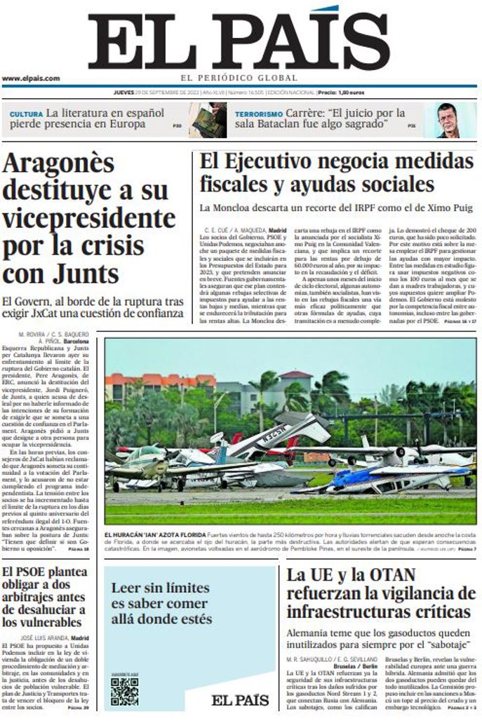 EL PAÍS: "Aragonès destituye a su vicepresidente por la crisis con Junts"; "El Ejecutivo negocia medidas fiscales y ayudas sociales"; "El PSOE plantea obligar a dos arbitrajes antes de desahuciar a los vulnerables"; "La UE y la OTAN refuerzan la vigilancia de infraestructuras críticas".